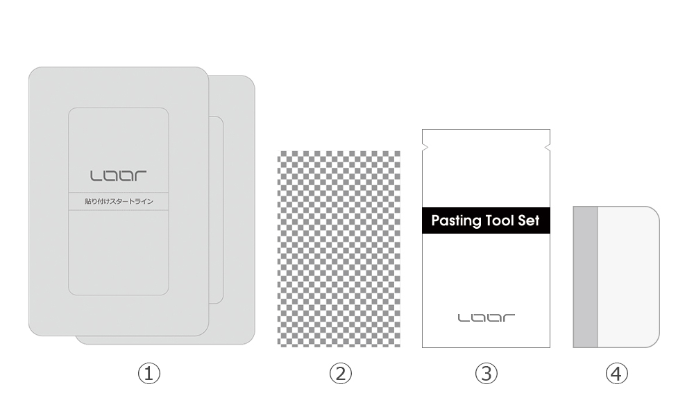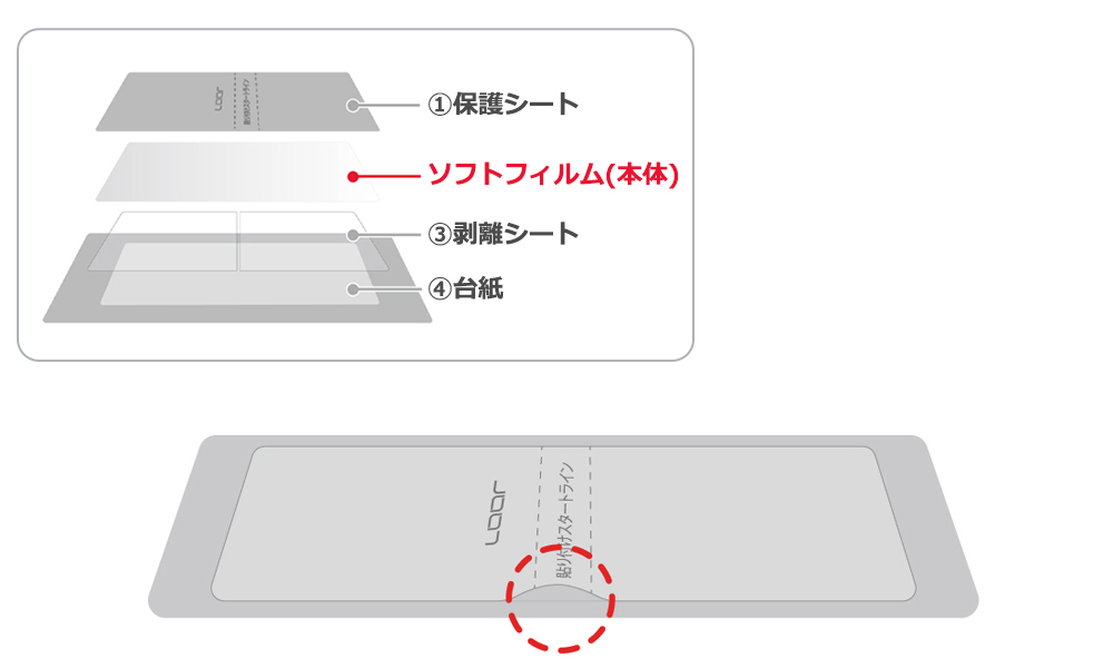 【上から①保護シート、②ソフトフィルム(本体)、③剥離シート、④台紙】