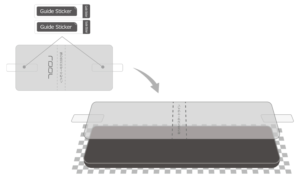 ガイドステッカーを持ち、位置を確認しながらフィルムを画面の上に置きます。