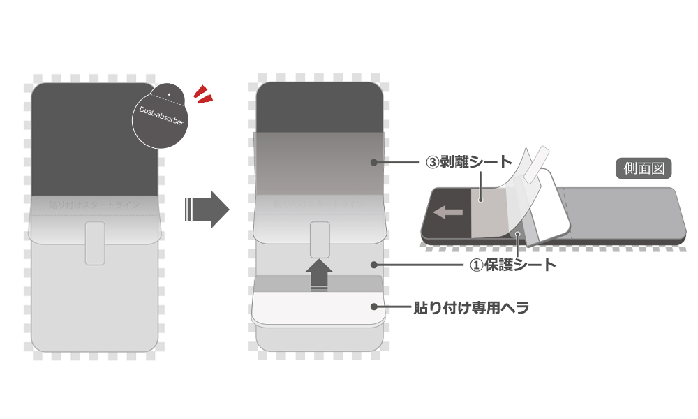 端末を縦向きにして、絆創膏を貼るように中央から半分ずつ③の剥離シートを剥がしながら②のフィルムを貼り付けます。
