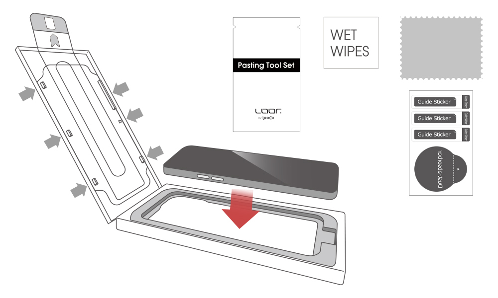 端末をBOXのフレームにはめ込み、付属のアルコールシートを使って端末の画面を綺麗にし、ホコリをDust-absorberで取り除きます。