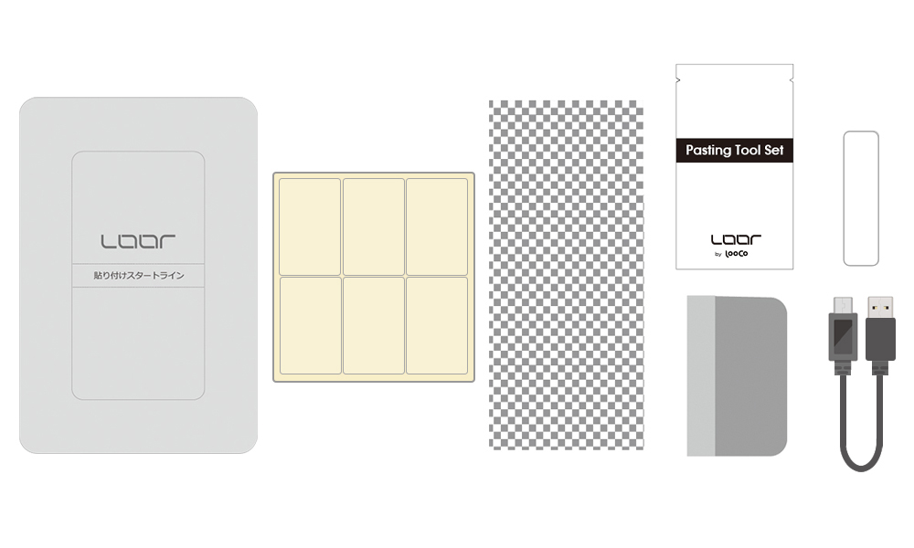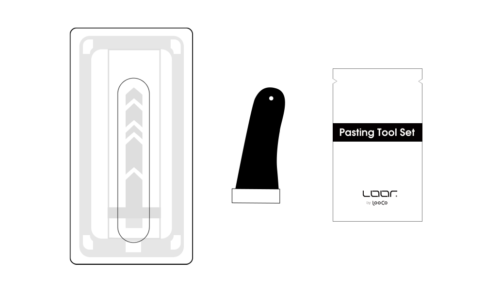 「LOOF」と印字されているフィルムが1枚入っており、滑り止め、貼付用カード、固定用透明シール 、硬化用UVライト、ライト用ケーブルが付いているスマホ用紫外線硬化強化ソフトフィルムの貼り付け方はコチラ!